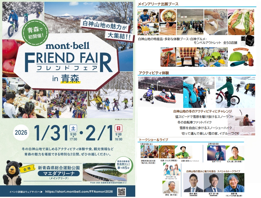 来る1月31日(土曜日)、2月1日(日曜日)に、青森市の新青森県総合運動公園マエダアリーナにおいて、モンベルフレンドフェアin青森が開催されます。