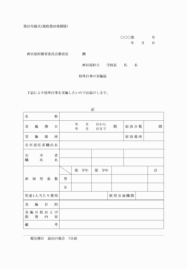 第二十条 校長は、規則第六条第二項の定めるところにより、校外行事の実施について届け出るときは、教育長に校外行事の実施届(第二十五号様式)を提出しなければならない。