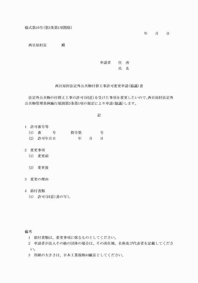 三 西目屋村法定外公共物付替工事許可変更申請(協議)書(様式第十号)