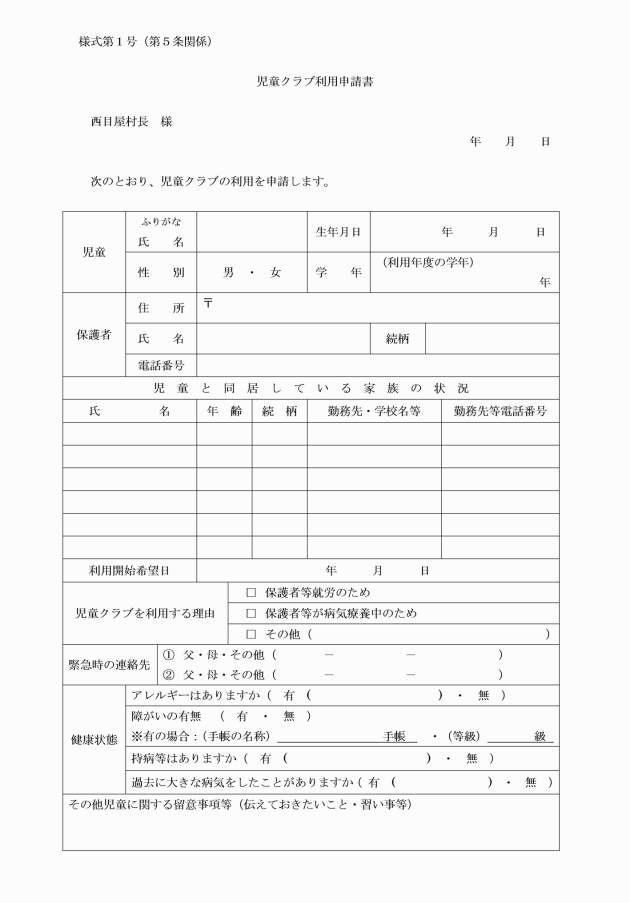 第五条 事業の利用の許可を受けようとする保護者は、児童クラブ利用申請書(様式第一号)に必要な書類を添えて、村長に提出しなければならない。